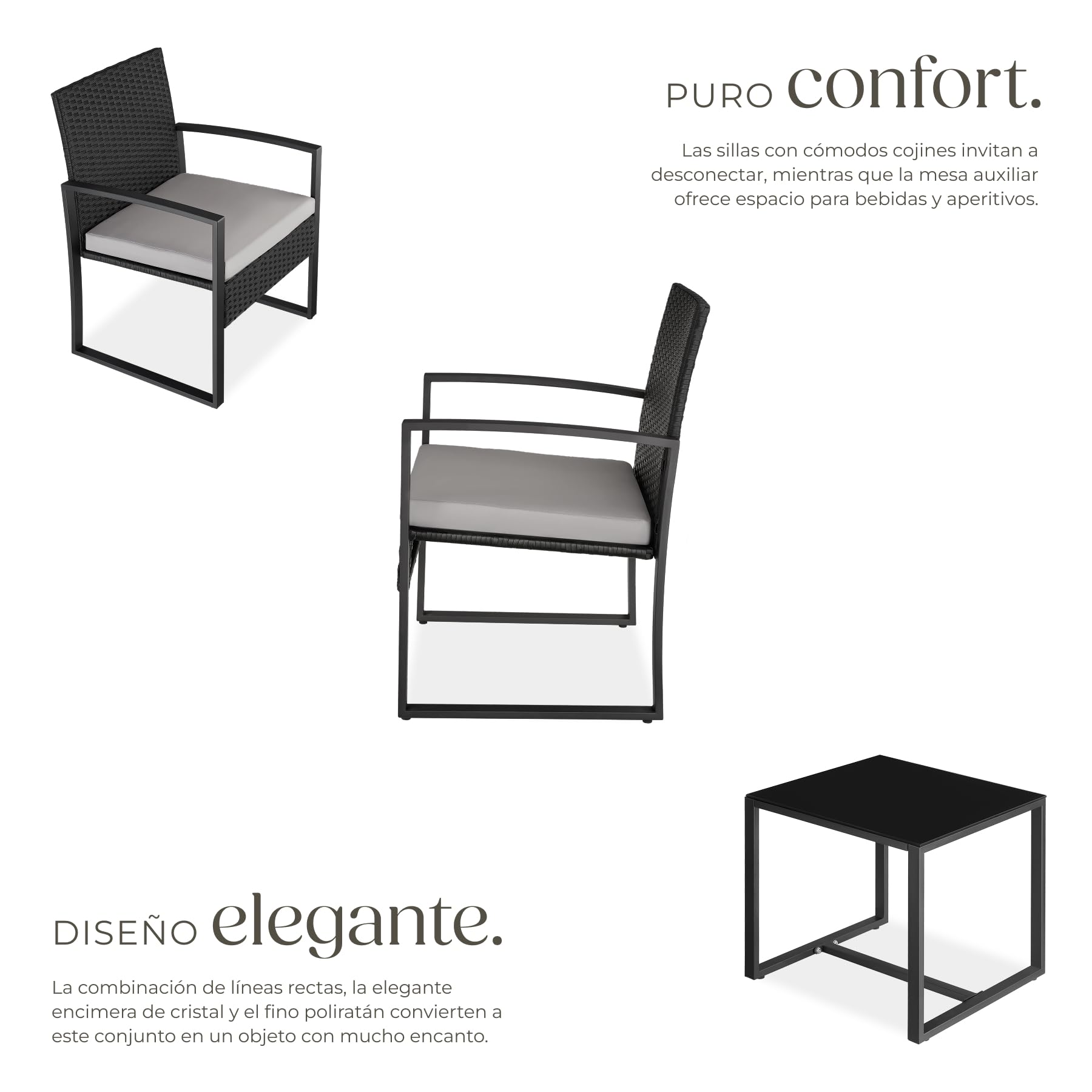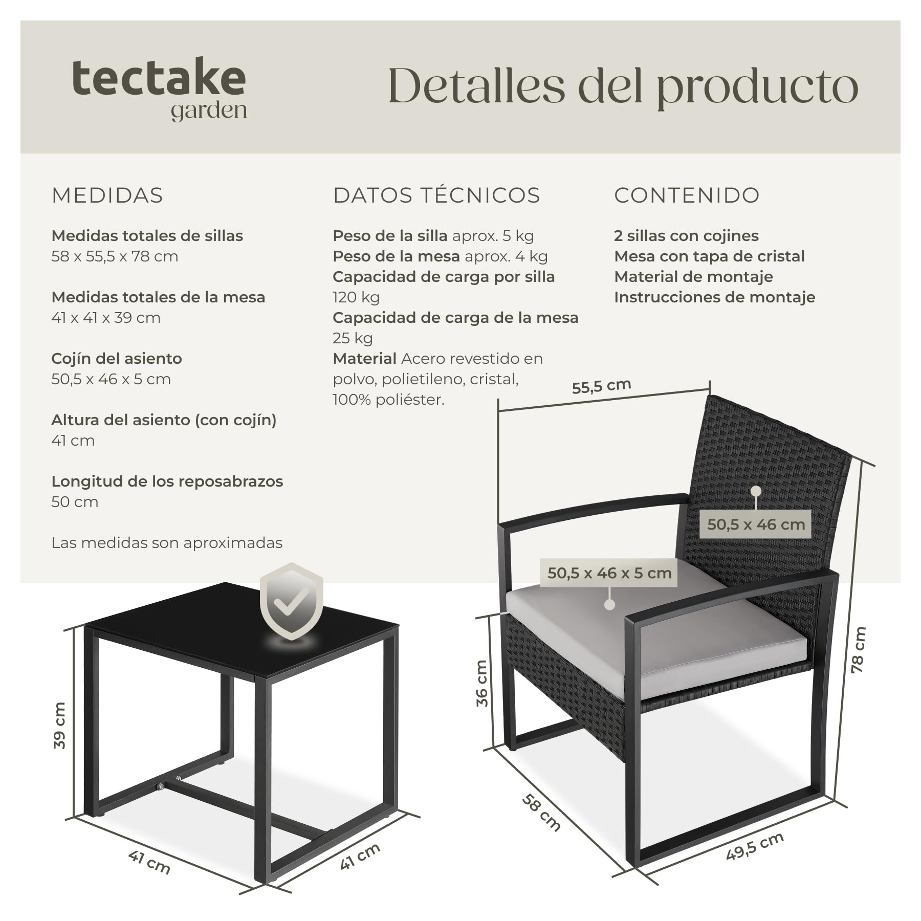 Este acogedor juego de muebles de ratán de tectake es perfecto para dos personas. Compuesto por dos sillas y una mesa de bistró, cabe en cualquier rincón de su jardín y constituye el complemento perfecto para juegos de comedor más grandes. Los delgados marcos de acero, la duradera malla de polirratán, el robusto cristal de seguridad y los cómodos cojines son perfectos para muebles de jardín de bajo mantenimiento. Además, las patas ajustables en altura garantizan una superficie nivelada, incluso en suelos irregulares. Disfrute de un café negro por la mañana o de un cóctel por la noche en su espacio privado al aire libre: disfrute de unas vistas de verano en la terraza, el balcón o en el campo con el acogedor juego de jardín Granada de tectake. Volumen de suministro: 2x sillas con tapizado1x Mesa con tapa de cristal1x Materiales de montaje1x Instrucciones de montajeDetalles técnicosSilla:Dimensiones totales AnxPxAl: aprox. 58 cm x 55,5 cm x 78 cm Cojín del asiento AnxPrxAl: aprox. 50,5 x 46 x 5 cmAltura del asiento con cojín: aprox. 41 cmAncho x alto del respaldo: aprox. 50,5 x 46 cmLongitud de los reposabrazos: aprox. 50 cmMarco An x Pr: aprox. 3,5 x 1,5 cmAjustabilidad de las patas de plástico: aprox. 0,5 cmCapacidad de carga: 120 kgPeso con acolchado: aprox. 5,2 kgMaterial: acero con recubrimiento en polvo, polietileno, 100% poliésterMesa:Dimensiones totales AnxProfxAl: aprox. 41 x 41 x 39 cmMarco AnxPr: aprox. 2,5 x 1,5 cmAjustabilidad de las patas de plástico: aprox. 1 cmCapacidad de carga: 25 kgPeso con tapa de cristal: aprox. 4 kgMaterial: acero con recubrimiento en polvo, vidrioAspectos destacados:Cómodo juego de asientos de ratán para dos personas. Tejido fino de polirratán resistente a los rayos UV. Estructura de acero sólida y duradera con recubrimiento en polvo. Fundas de cojines desenfundables, impermeables y lavables.